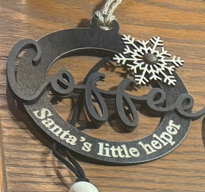 This enchanting ornament has “Coffee” cut out in bold letters across the front top layer capturing the joy of holiday caffeine. Below it, the phrase “Fueling Christmas Magic”, “Coffee Beans and Christmas Dreams” or “Santa’s Little Helper”  is elegantly engraved and bordered by intricate snowflake designs. A real coffee bean or two are subtly embedded, bringing an authentic, aromatic touch.  These wooden ornaments radiate holiday charm and is perfect for coffee lovers fueling the season’s magic, dreaming of coffee by fire this Christmas and those needing a coffee-fueled helper this season.