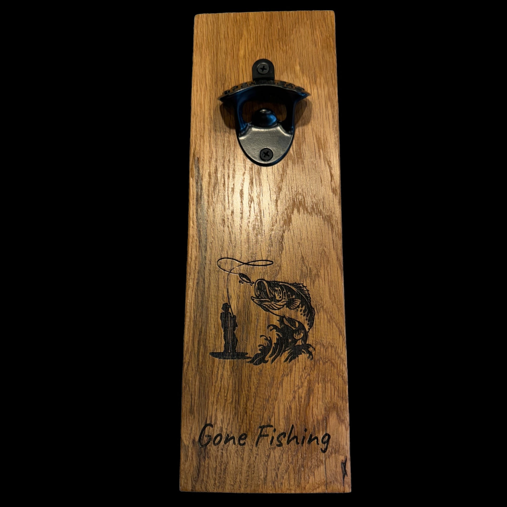 Personalized Black Iron Bottle Opener on Solid Oak with Fishing Engraving – Custom Orders Welcome!